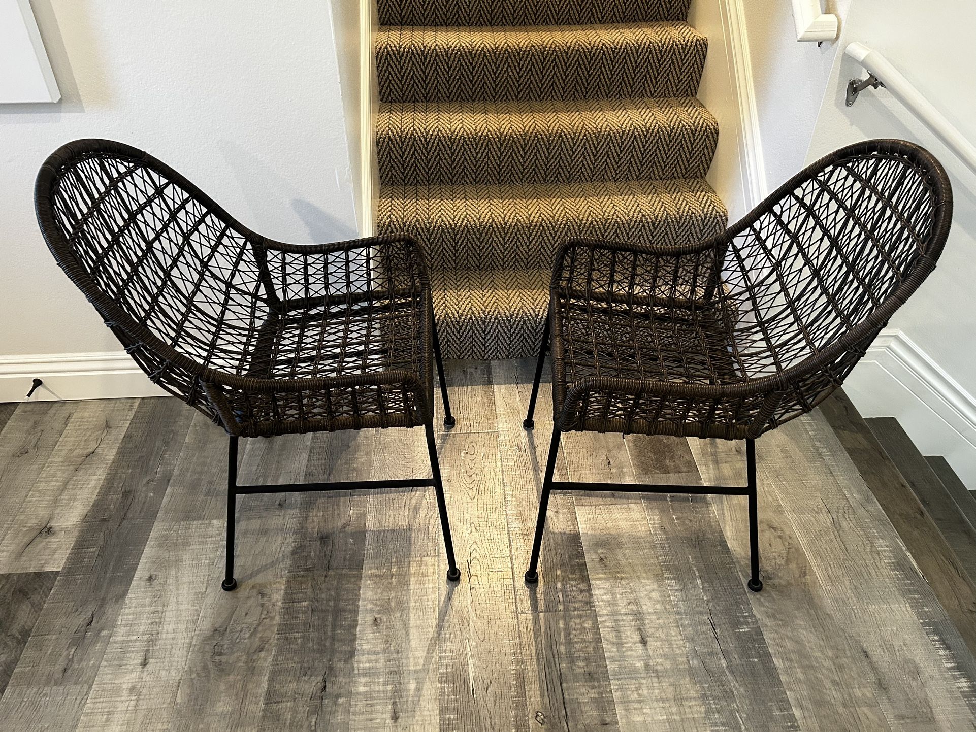 Bought a few months ago. Remodeling home and these no longer fit decor. $75 each or two for $100. I paid $400 each new. Product Description Clean, contemporary shaping and an updated weave transform all-weather wicker into something modern. This low-armed dining chair is supported by a contrasting black iron base. Safe for outdoor spaces - cover or store indoors during inclement weather and when not in use. Product Dimensions & Spec Overall Dimensions: 21.00"w x 26.00"d x 35.25"h Seat Depth: 17.5" Seat Height: 18" Arm Height from Floor: 23.5" Arm Height from Seat: 5.5" Colors: None, Natural Black, Distressed Grey Materials: Iron, 100% Polyethylene Weight: 18.96 lb Seat Construction: Woven