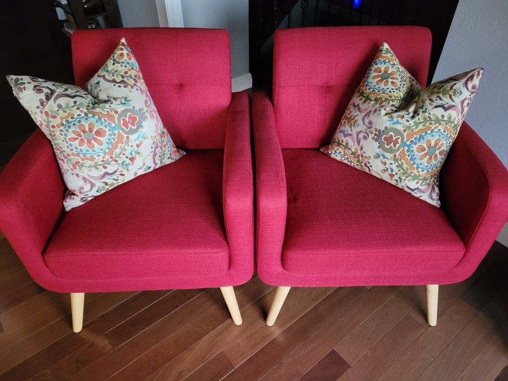 Two Fabric And Wood, Red Upholstered Accent, Living Room Chairs From Macys Furniture Rarely sat on, only decorative really in our living room. Looking to downsize. They are in near perfect condition Asking $350 for the pair, paid $650 each about a year ago. Make me an offer. Smoke and pet free home Delivery is available for a fee I'll throw in the two pillows pictured for free if you'd like them. Mid century modern style, accent chairs, decorative chairs, living room chairs, upholstered, linen, mcm, family room, office, furniture, mid-century modern, mid-century