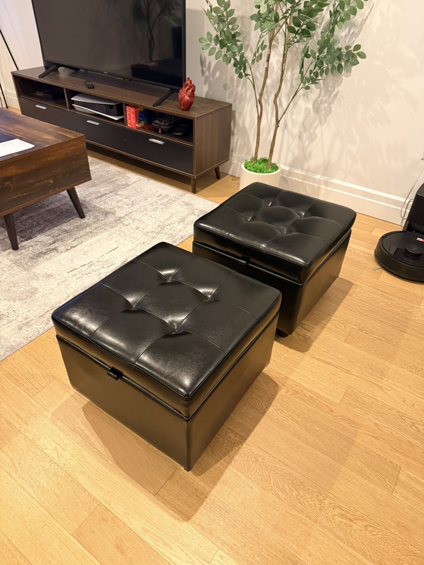 Maximize your NYC storage space with this matching pair of black faux-leather storage ottomans. Perfect for hiding away extra blankets, books, or shoes while adding extra seating to your living room. The Details • Design: Modern tufted tops with a sleek, easy-to-clean black finish. • Storage: Flip-top lids with durable metal hinges provide deep internal storage to keep your space clutter-free. • Versatility: Use them as footrests, extra guest seating, or even side tables with a tray on top. • Condition: Excellent condition, well-maintained in a clean home. Pickup: Easy pickup on Hell’s Kitchen! These are sturdy but light enough for one person to carry comfortably.