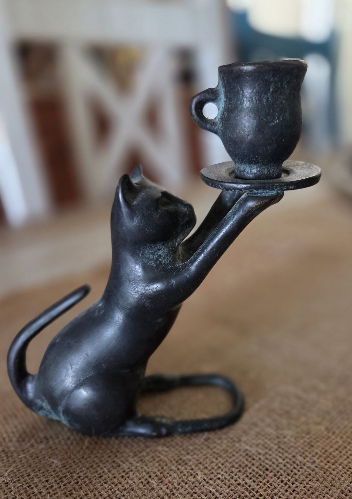 Vintage bronze cat w/teacup candle holder