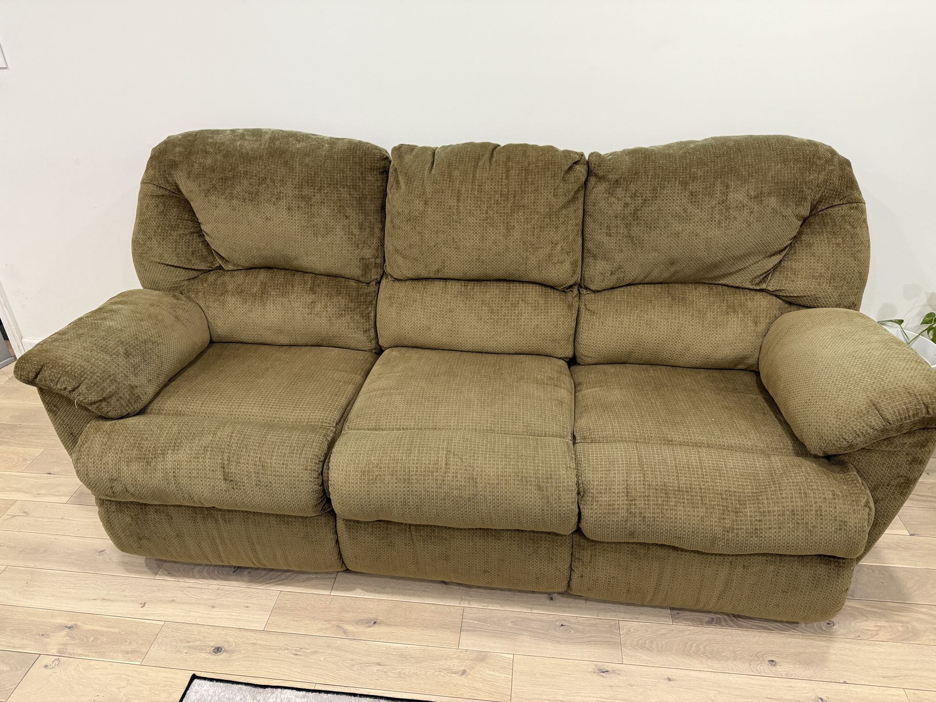 Spacious 3-seater recliner sofa. Both ends recline, great for lounging. Color is a brownish-green, super comfy.