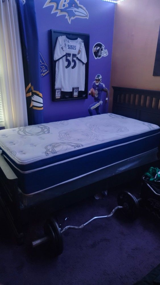 Solid wood twin bed with mattress & box spring rarely used. The photos are part of the description. Please feel free to ask questions. You must disassemble and haul it hence the price. Thanks ✨️