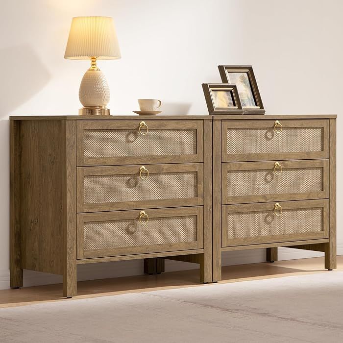 Nightstand Set of 2 with Drawers, Rattan Nightstands, Large Modern Boho Night Stand Wide Bedside Tables for Bedroom