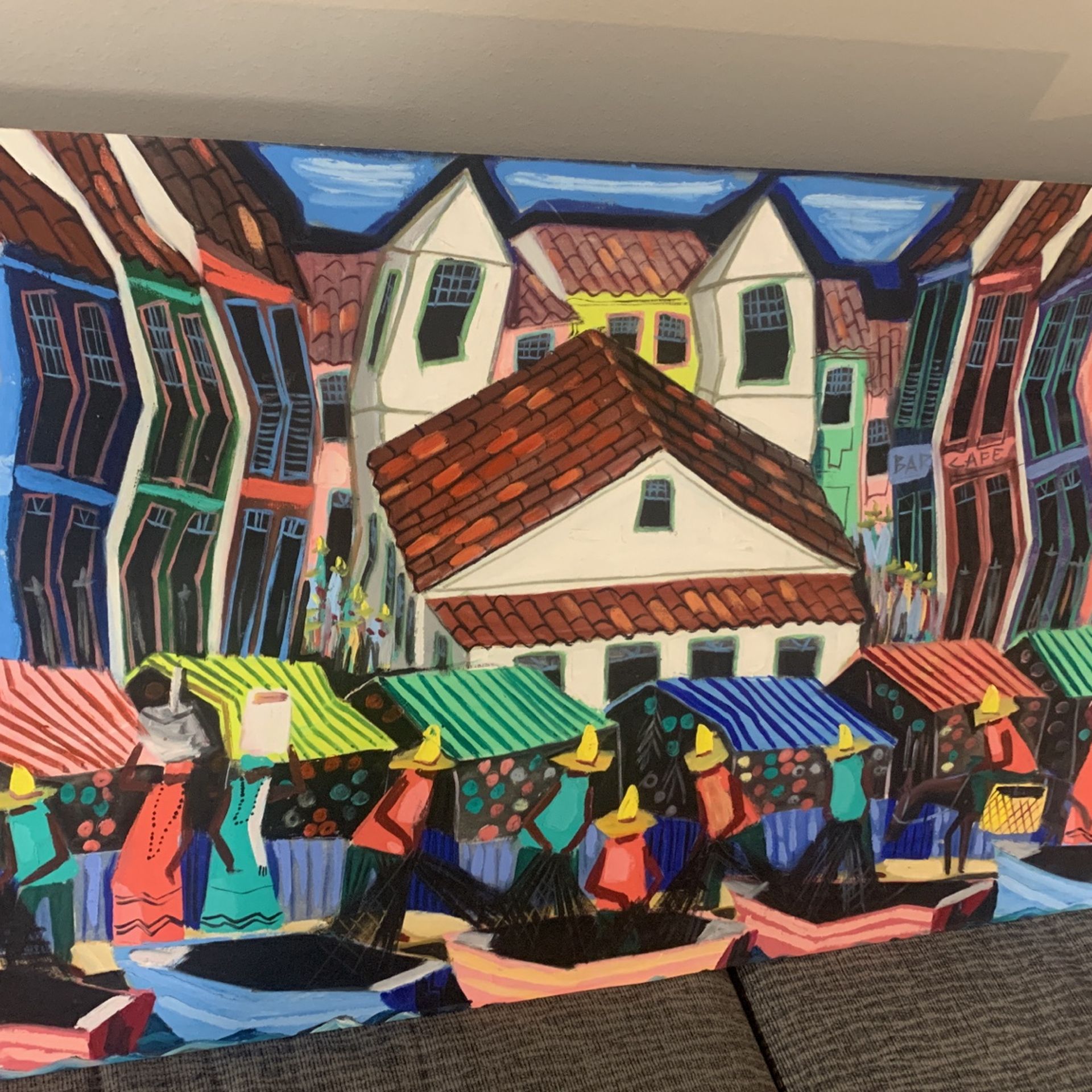 Marketplace, painting by W Lima. It looks and feels original. Needs to be framed. 24 x 44. Great conversation piece perfect for a restaurant or in a large kitchen. Hard to stop looking at the abstract painting make an offer!