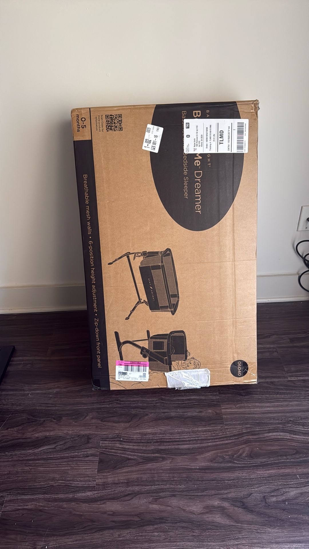 Beside Me Dreamer, Bassinet and Bedside Sleeper from Baby Delight. 0-5 months, breathable mesh wall, 6 position height adjustment and zip down front panel. Never been opened.
