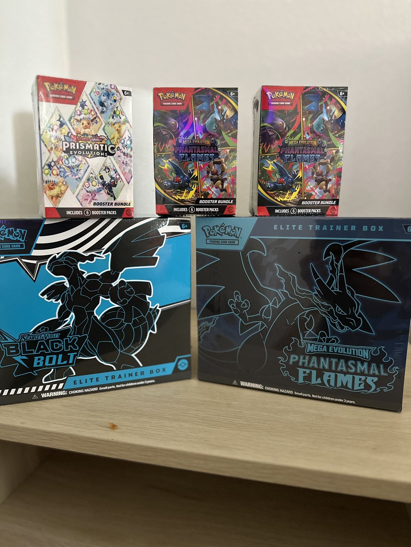 5 Phantasmal flames booster bundles $50ea $230 for all 5. 2 Phantasmal flames ETB $80ea $165 for 2. 1 prismatic booster bundle $50 1 black bolt ETB $75