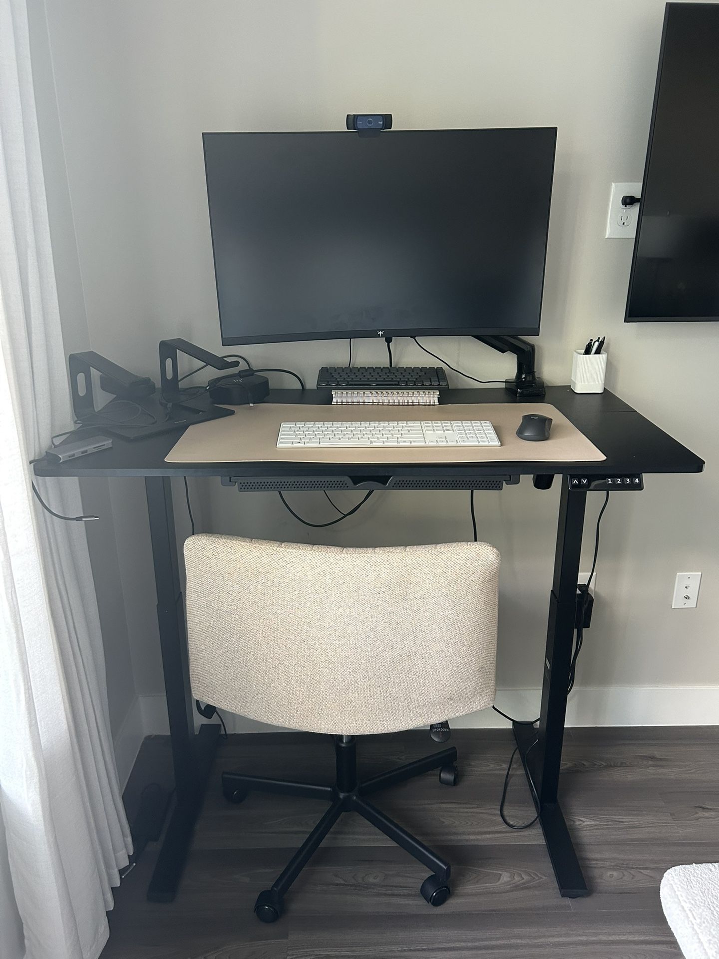 Black adjustable standing desk with a sleek, modern design. Easily switches between sitting and standing for improved comfort and productivity. Chair is also available for additional cost.