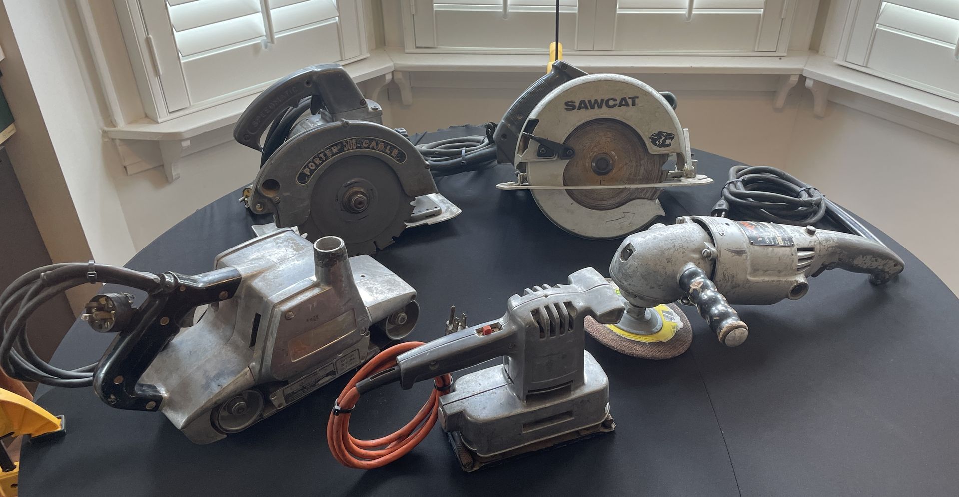 Lot of 5 vintage heavy duty corded power tools. These were part of my grandfather’s estate and while a few may look rough, he was very particular about maintaining his equipment (he built homes for 50+ years). I already have too many electric power tools so these never get used. I have lightly tested them prior to listing (plugged in and ran each for 30-60 seconds) and they all seem to be in good working order. Items included: 1. Black & Decker Sawcat 8-1/4” Circular Saw (Model 2685) 2. Porter Cable 7-1/4” Circular Saw (Model 508) 3. Skil 7” Disc Sander (Model 853 Super Duty) 4. Rockwell Porter Cable 3”x24” Belt Sander (Model 360) 5. Black & Decker Deluxe Dual Action Hand Sander (Model U-240) Please DM me with any questions. Thanks!
