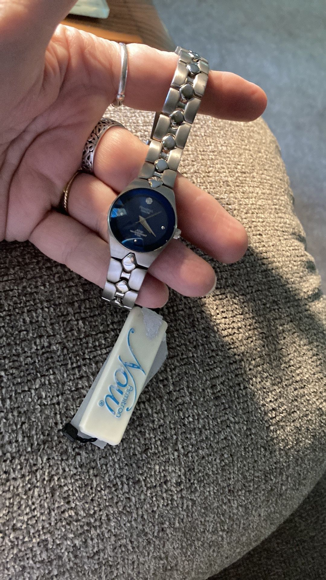 New with tags and a new working battery. Water resistant steel. Has a second hand. No numerals on dial. Great gift for your lady young or mature.