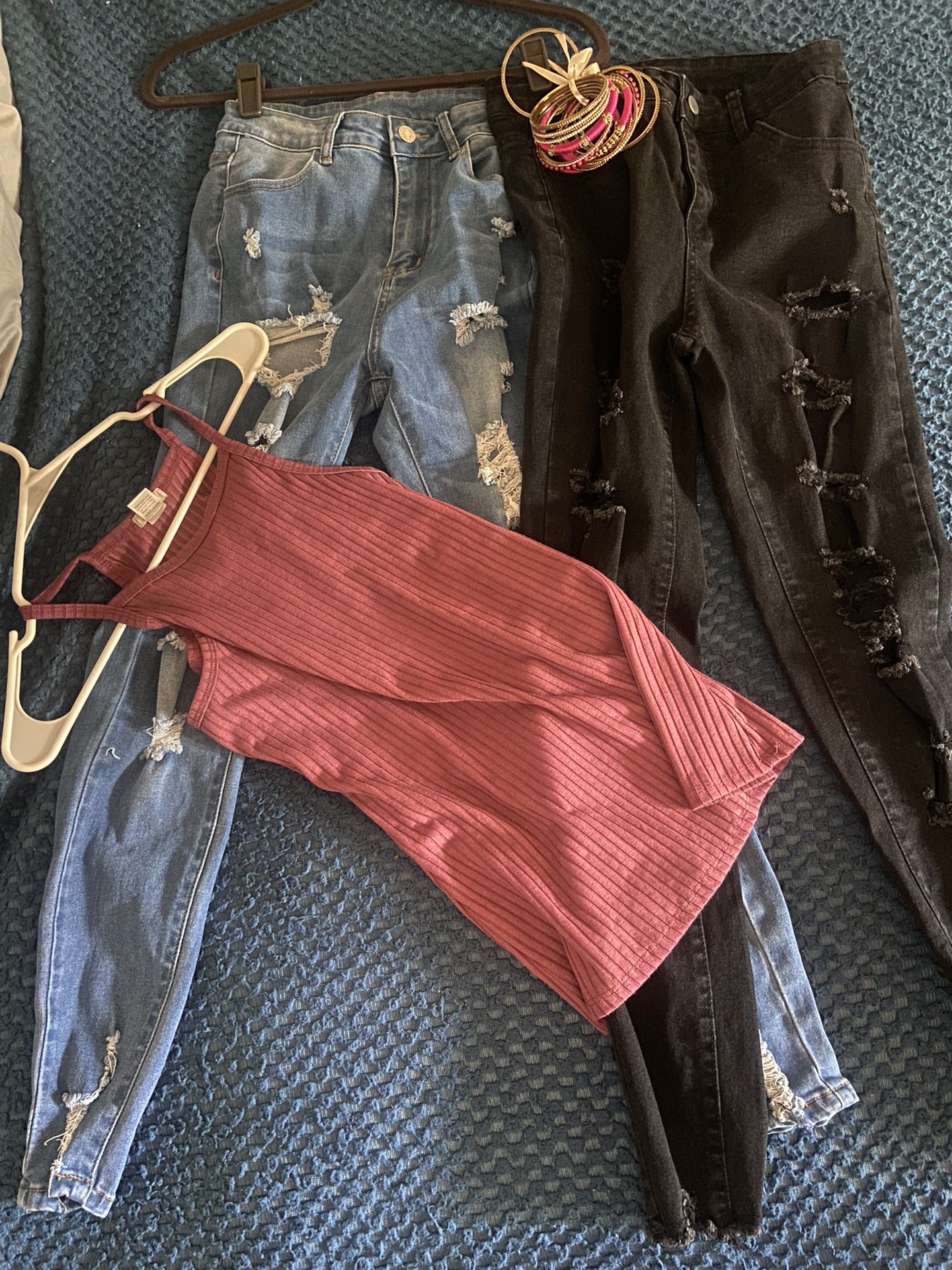 Two pairs of SHEIN ripped jeans gently used a few times size small if you know SHEIN sizes it’s about a size 4 includes a mauve tank top and a set of bangle bracelets pink and gold price is firm $15 for all