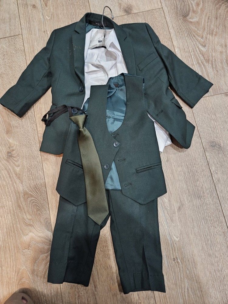Toddler boy green suit. All items in picture included. Size 3. Only worn once but will need to be cleaned. Paid 100. Selling for 30. Pick up in west covina.