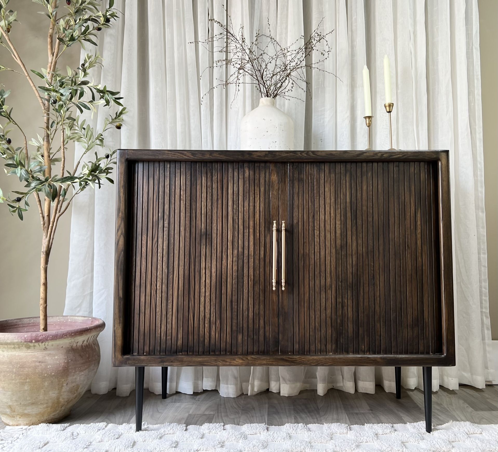 Vintage solid wood credenza/cabinet/bar, with fluted doors. The old finish was completely stripped off, then stained in a dark walnut and triple sealed in a semi-gloss lacquer, giving it a flawless finish with superior protection and durability against everyday wear and tear. The inside was also refinished, with new stain and sealant. The inside features a cute built in shelf that is lined in designer wallpaper, that also matches the back, setting a cool, moody vibe. It’s elevated with 10 inch matte black legs, and has champagne brass handles. The doors roll great and is it overall fantastic condition for its age! This piece could be used in so many different places in your home. In a dining room as a credenza, sideboard, buffet, a bar, tv stand/ entertainment console, nursery, entryway, hallway, bathroom, office ect. Dimensions: 45”L 20”D 38” H -About my work- I’ve been perfecting my craft of refinishing high quality, solid wood furniture for 9 years. I pride my work on attention to detail and providing excellent and smooth paint and stain finishes, sealed with polyurethane or lacquer. I use only non toxic, high quality products. If you have a piece you’d like refinished, Please reach out😊 I accept cash or Venmo and require a deposit to hold an item. All pieces are in great vintage condition and sold as is. Sales are final.