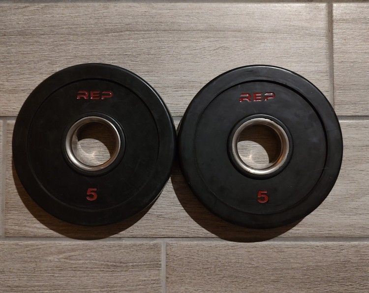 I have a gently used pair of Rubber coated 5 lb REP Fitness weight plates These will fit olympic 2' diameter Barbells