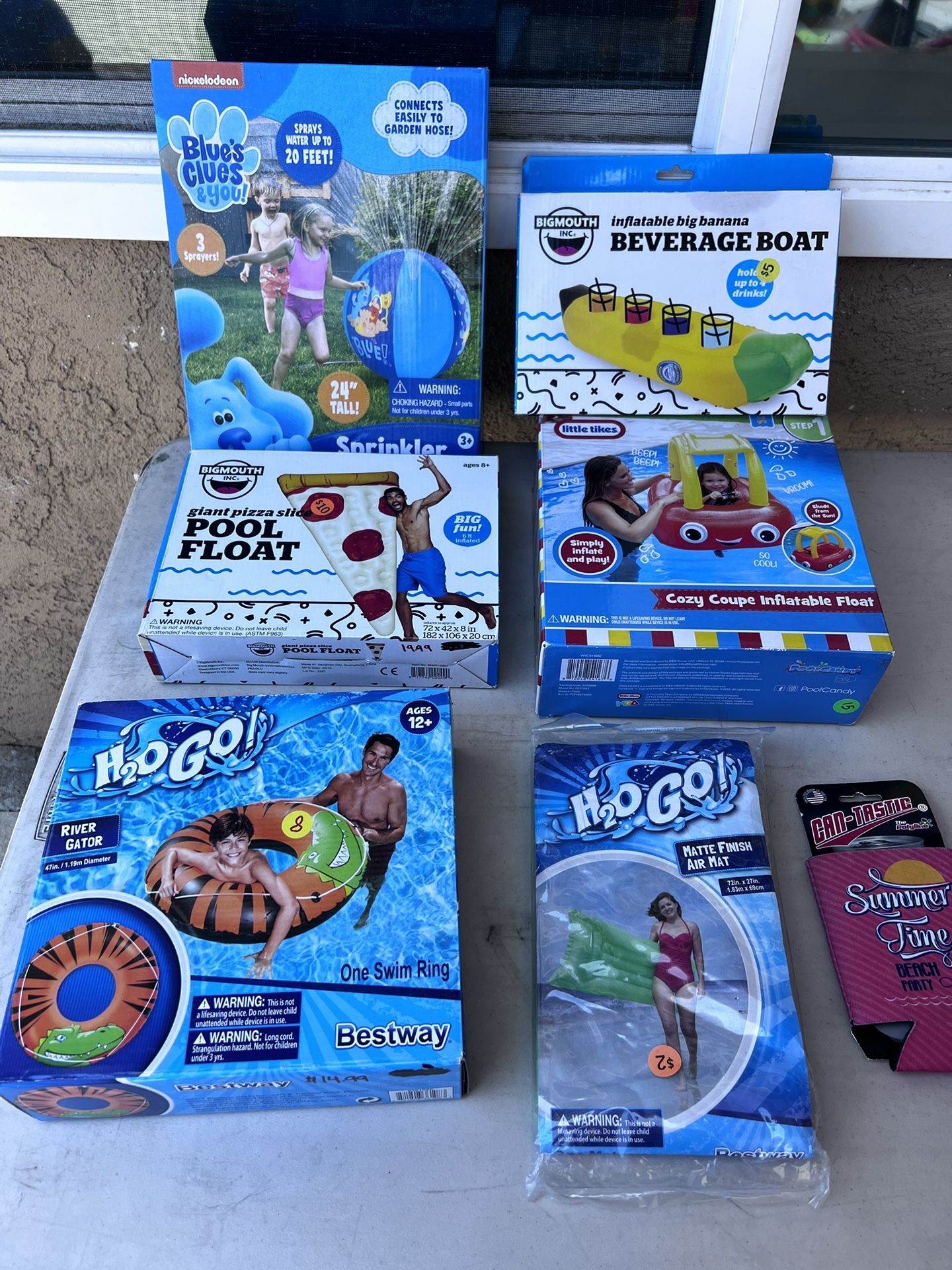 Float and roll air mat $3 each Toddler spring float $ 8 sold Adult spring float $ 10 each one more Necklace fan $ 3 each Giant pizza slide pool float $ 10 River gator swim ring $ 8 Mate finish air mat $2 Summer time drink sleeve $ .50 Cozy inflatable float $ 10 sold Banana beverage boat $ 5 Blues clues sprinkler $ 6i