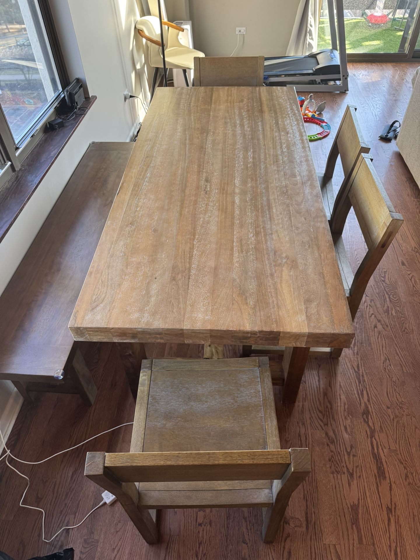Original price $2,800 for everything. Listing for $1,500 - almost half off!! Great solid wood dining table, chairs and bench. One chair has a cross piece on the bottom that is split and in photos. Otherwise very good quality. We are just moving and table won’t fit in the new place. Four chairs, one bench, two leaves to extend size.