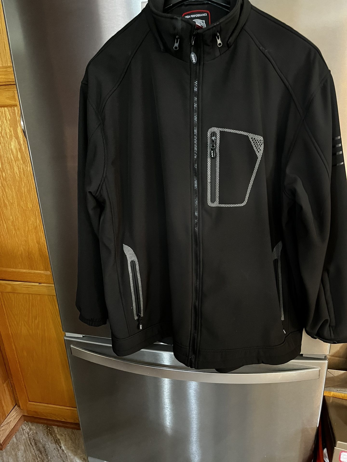 Size 4x lots of zippered pockets it’s probably waterproof. A very light jacket