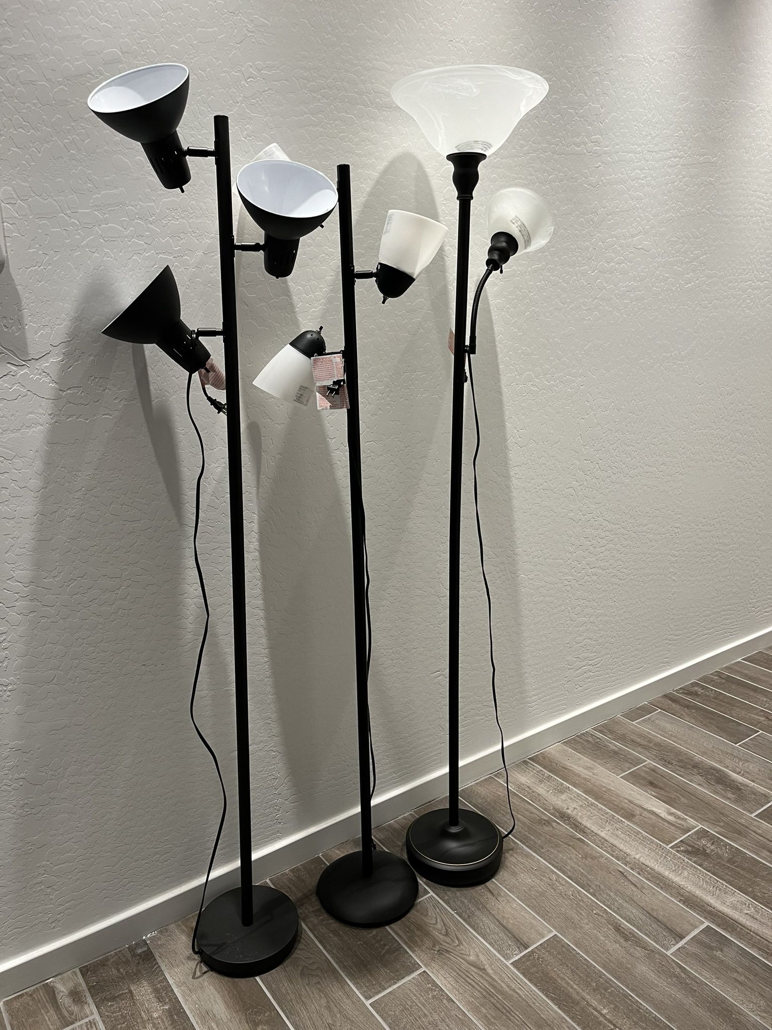 Hello, I have for sale three stand up lamps for sale. These are slightly used and still in great condition. I am asking 120 picked up for all three in Yuma, AZ (bulbs included with sale)