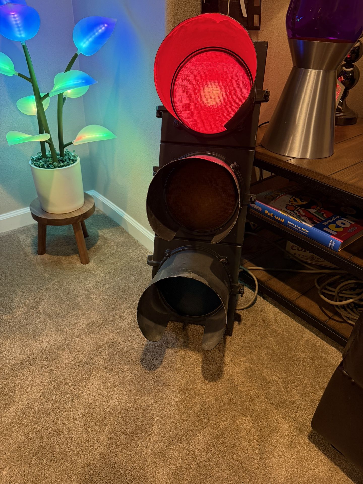 Vintage traffic light signal. Has LED bulbs for energy efficiency. Installed with a digital traffic signal sequencer board that allows for full customization and more than 39 different sequences. Can be set up to stay on a particular color and timing and more! Heavy duty construction with an eye lit for hanging. Measures 10 inches wide by 32 inches tall.