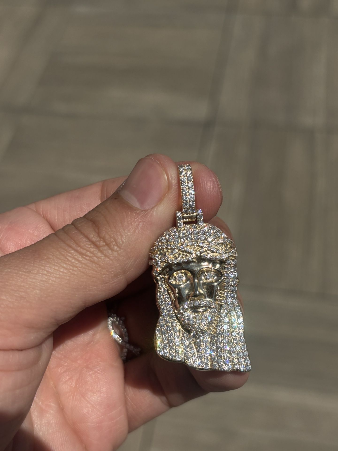 Custom Jesus piece pendant all hand set with natural diamonds . 14k 15.52g Natural VS1 f color diamonds 3.68ct 2 inch tall with bail 1.50 inch pendant Not a personal item so no low Ballers I’m a private jeweler in downtown Los Angeles message me to book an appointment . Insta - TrendSetterJewelers_