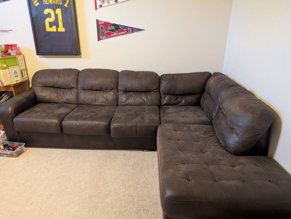 Large dark brown, soft-leather sectional sofa! Chaise is not modular; is situated as shown. Seats are deep, and not overly firm (very plush and comfy!). Last picture is a diagram with measurements!