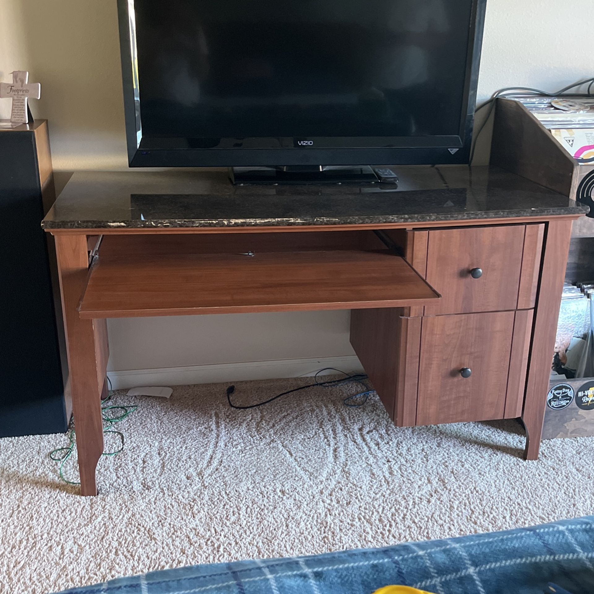Solid and sturdy wood desk with faux granite 53”W x 23.5 D x 30.5 H
