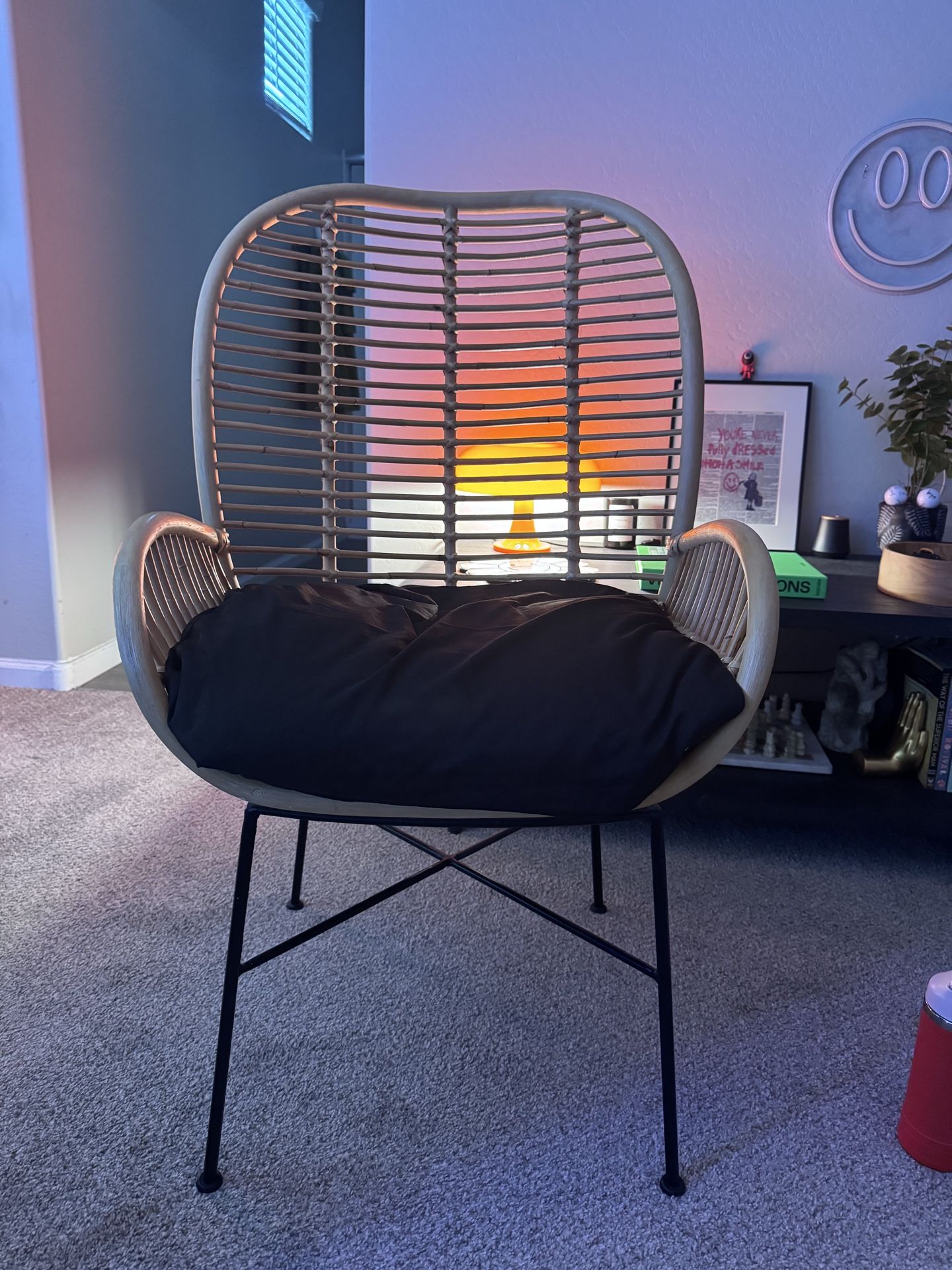 Super clean modern accent chair with a woven/rattan-style frame and black cushion. Perfect for a living room, bedroom, or office setup. Minimalist + boho vibe — fits really well with modern or aesthetic spaces. • Sturdy metal legs • Comfortable seat with removable cushion • Lightweight but solid • Great condition (no damage) Only selling because I’m switching up my space.