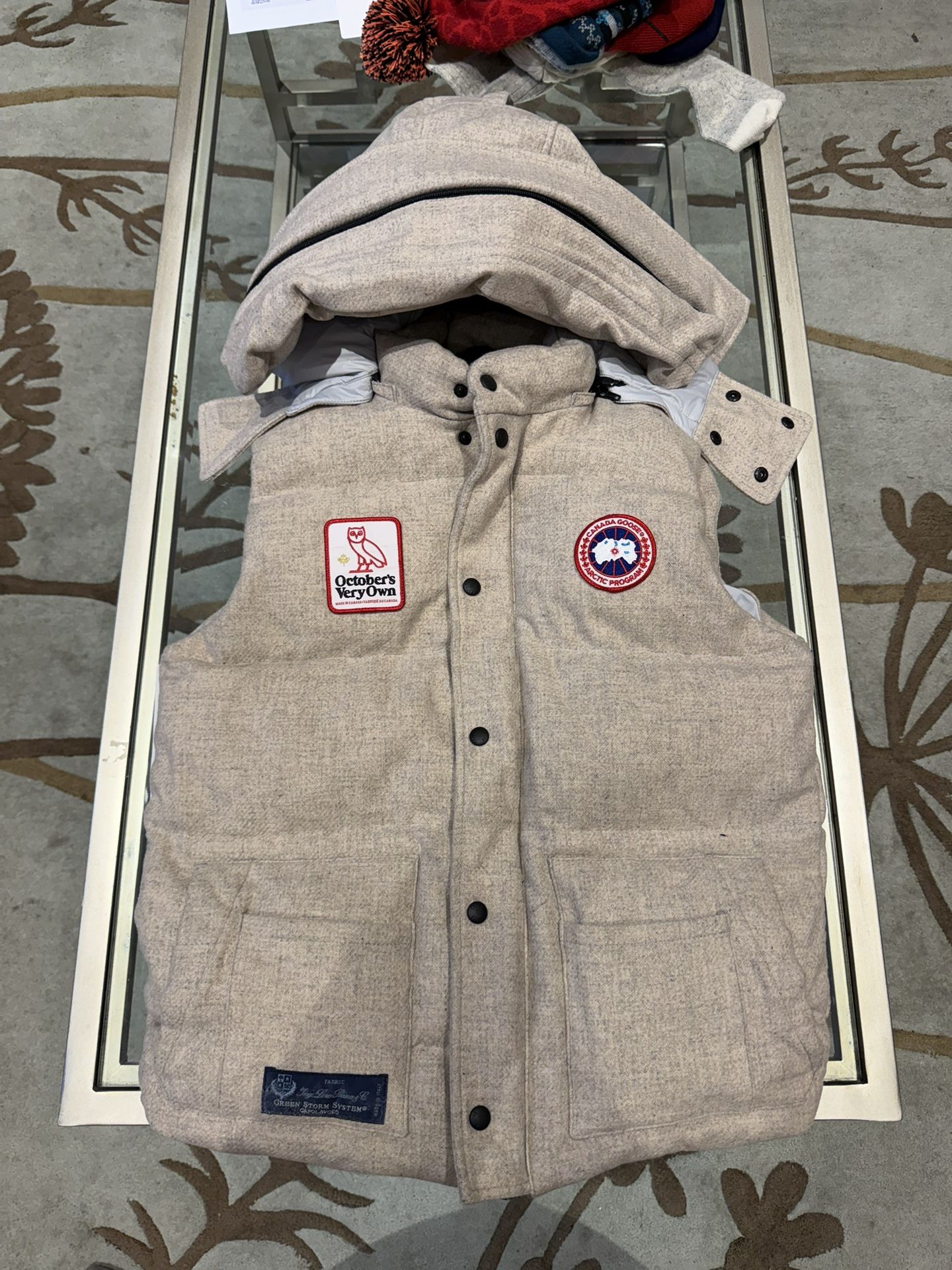 Trade for nike Jordan Alaska size 10 meetup glenview police station The OVO x Canada Goose Freestyle Vest in Camel, size Large, is a stylish and practical outerwear option for men. Hood is included. Made with wool outer shell material and insulated with white duck down and feather, this puffer jacket is perfect for the colder seasons. The zip closure, logo accents, and beige color make it a versatile piece for casual occasions.
