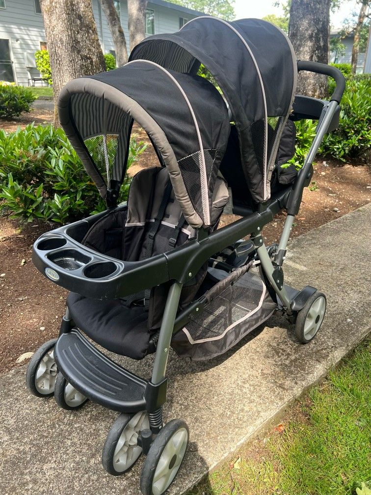 Awesome adjustable stroller. Many different positions options including for babies in car seats to older kids (see pic). Very smooth ride and easy to steer. One small scuff mark that doesn't affect usability (see pic) Stored indoors, no pets/smoke (but probably a bit dusty from storage)