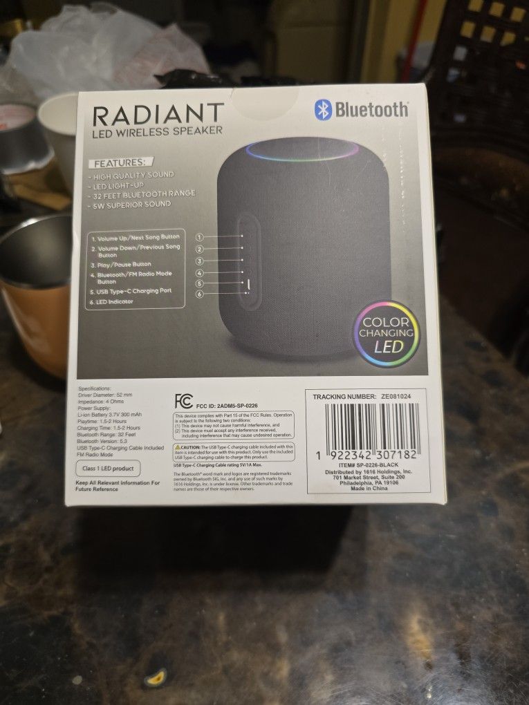 Bass Jaxx led wireless speaker Volume up/ next song button Volume down/previous song button Play/ pause button Bluetooth/FM radio mode button Usb Type C-Charging Port Led Indicator