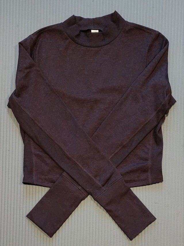 Get it going in this plum-colored activewear crop-top from Old Navy. The neck is somewhere between a crew neck and turtle neck- leaning more toward crew neck. There are no thumb holes at the bottom of the sleeves This is a cropped workout shirt, so please note that a modest amount of the midriff will show.The rise hits slightly above the belly button. Only modest amount of skin will show. My video shows the lining inside. The color is insane.