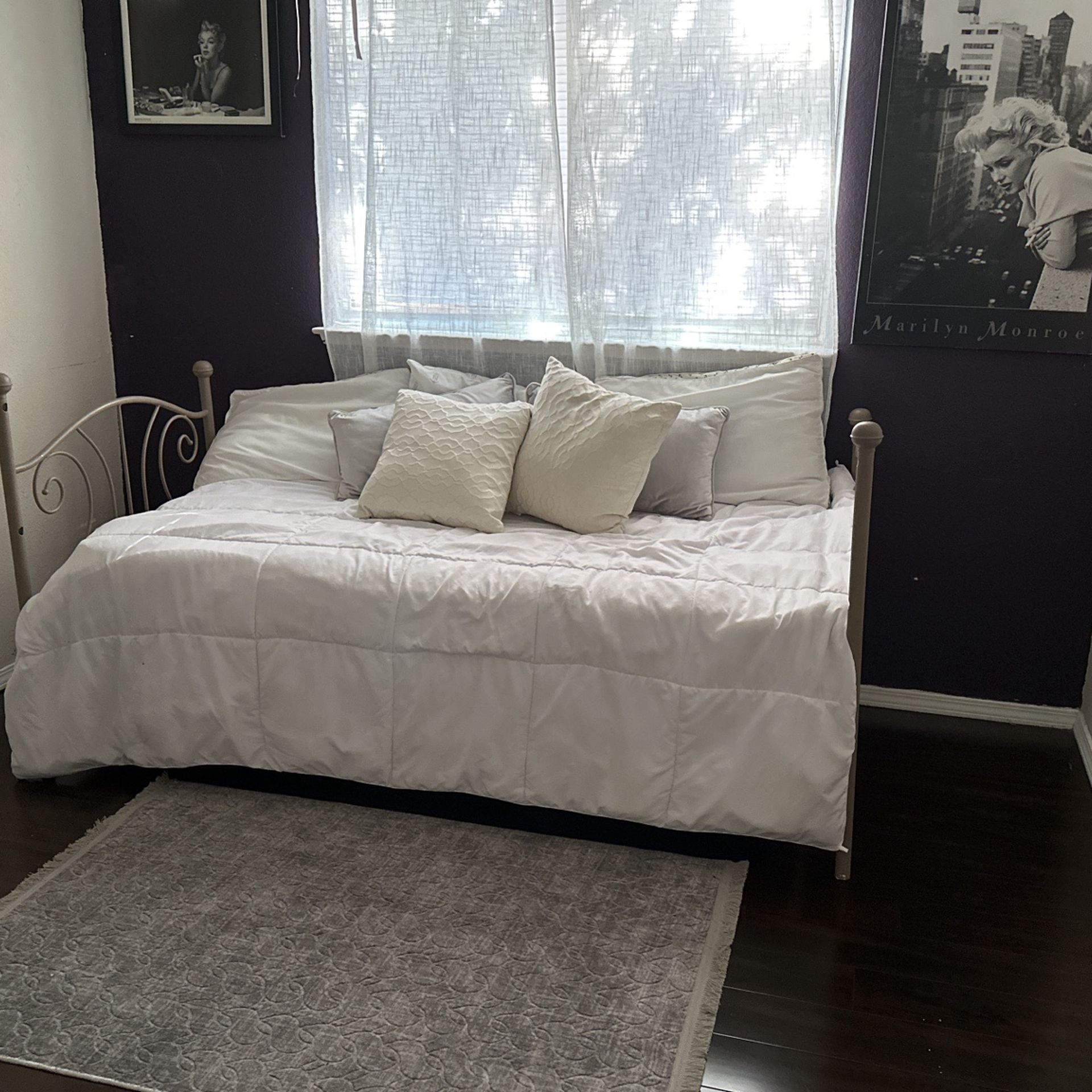 Frame and 2 twin mattresses included. The bed underneath had a wheeled frame and easy to move/adjust. Pick up only.