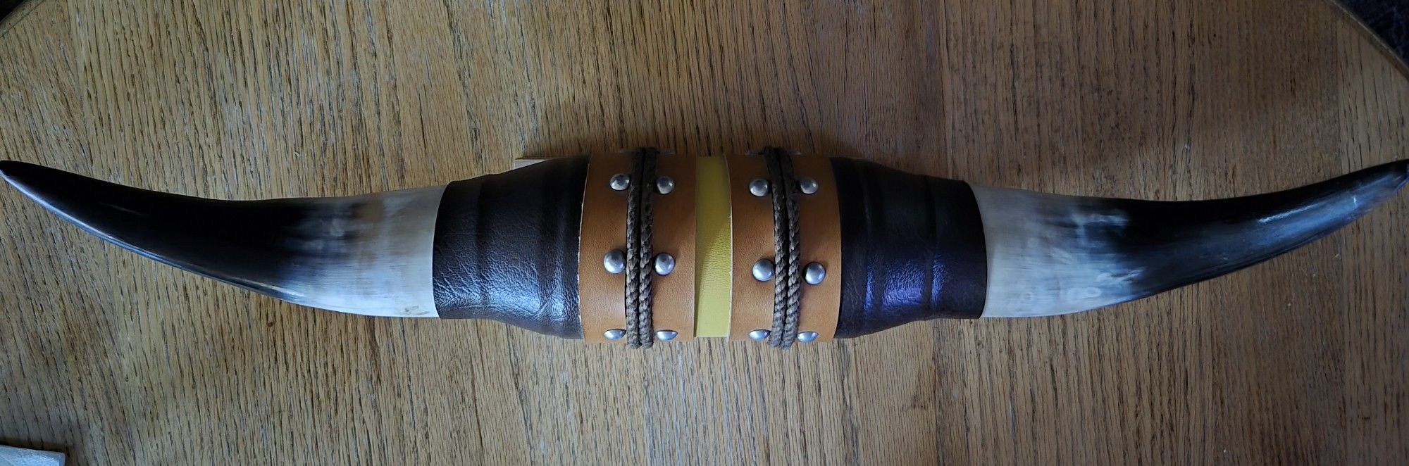 Taxidermy bull horns is expertly wrapped in leather and rope and mounted on a wooden plaque for display purposes. Hang these imposing beauties over your mantle, in an entryway, or over a doorway to add a natural bovine element to your decor. Used, but in perfect condition. No scratches or imperfections
