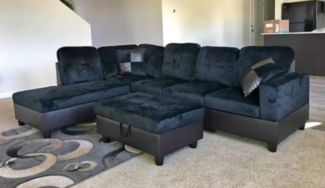 New Sectional with Storage Ottoman at only $600 ( NEW IN BOX. ) " FREE LOCAL DELIVERY " Overall dimensions 103x74x35"H Sofa. 71 1/2 x 32 x 35" H Chaise 74 1/2 x 32 x 35" H Ottoman 37 x 24 1/2 x 16 1/2" H