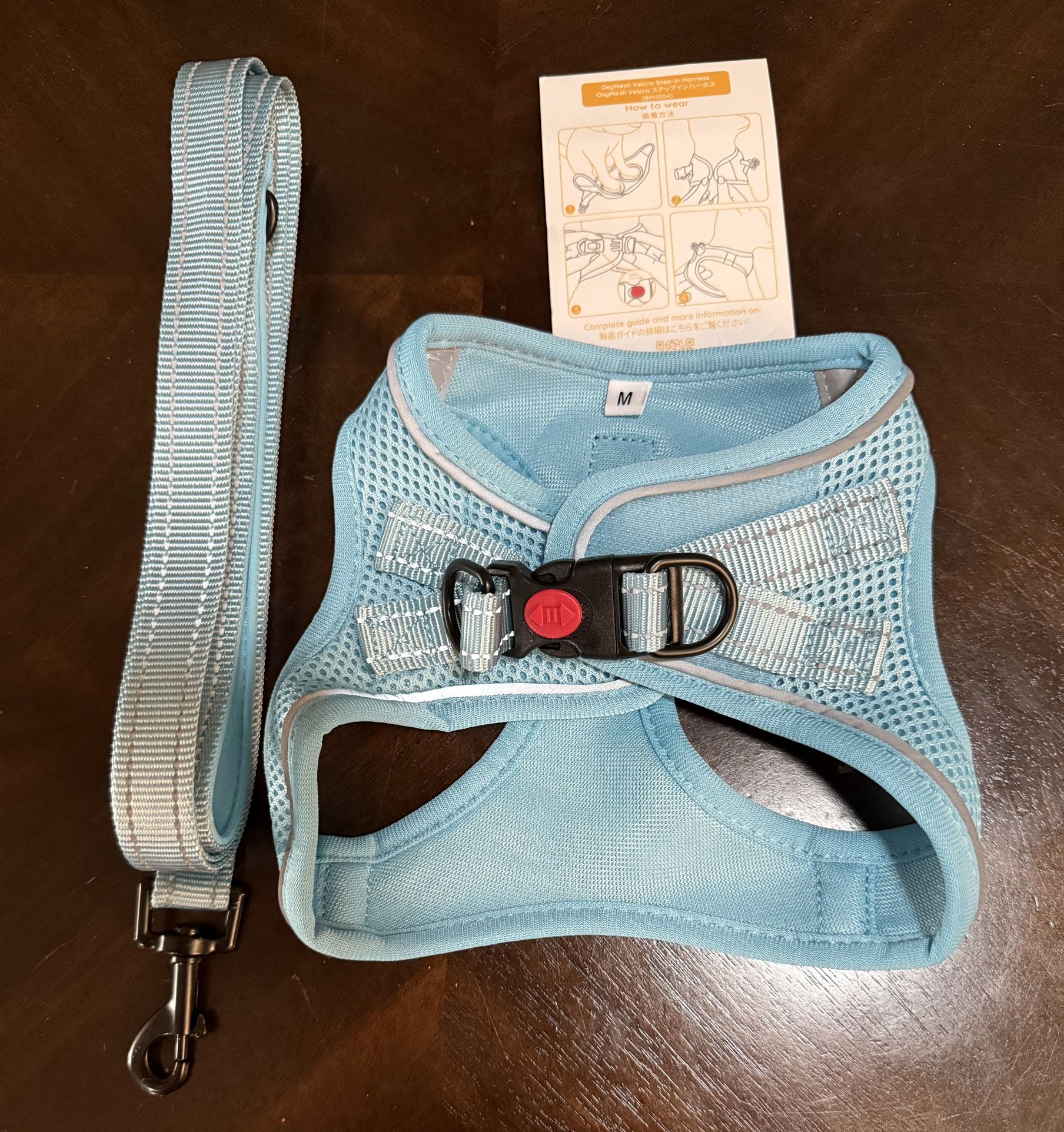 Small dog harness with matching leash. Ordered a medium for my dog and received this (marked ‘M’). But would not fit around my dog’s neck or chest. Will fit dog up to about 10-15 lbs. Brand new. Never used. $8