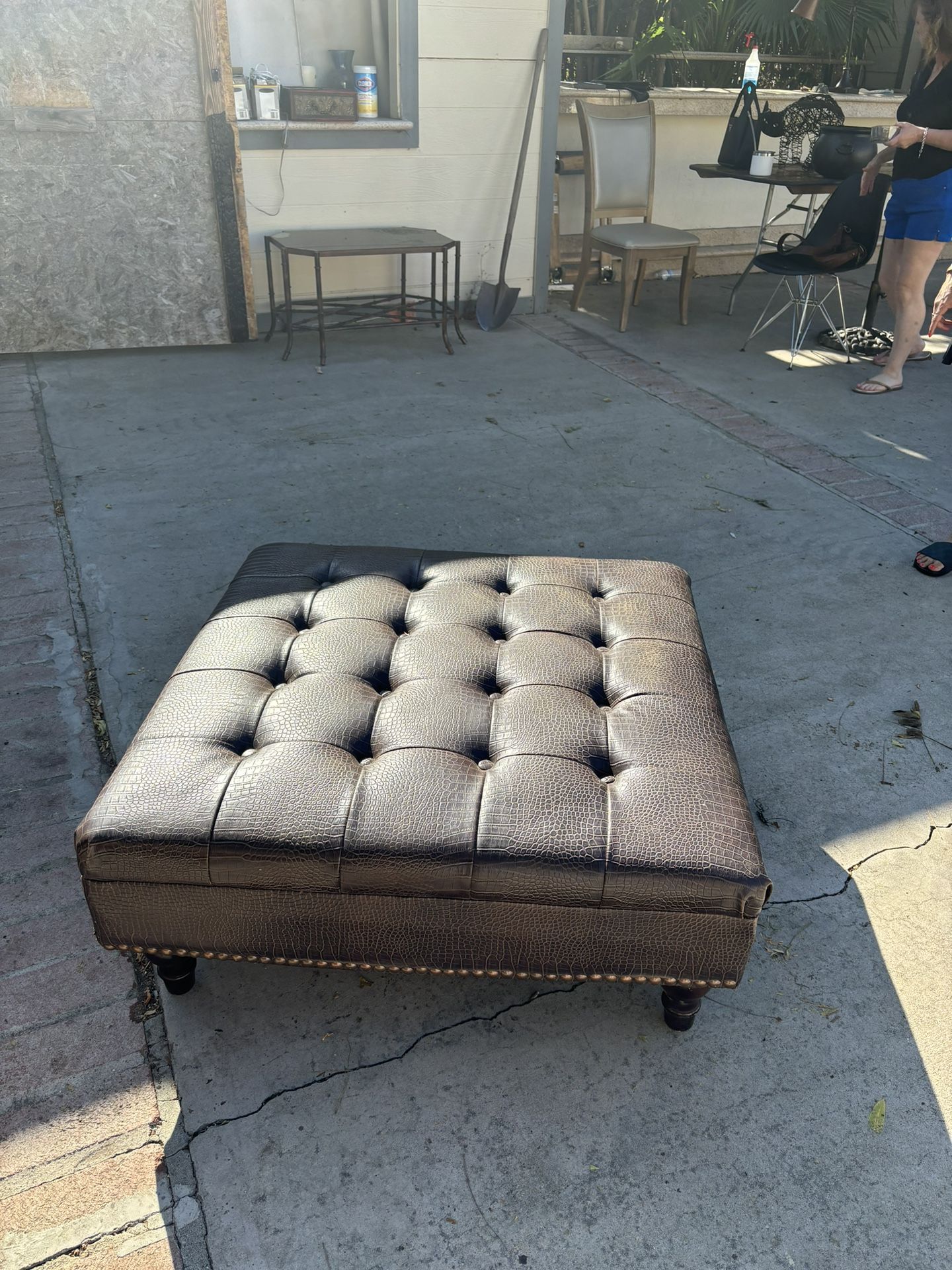 • CASH ONLY Upholstered in rich, textured faux reptile brown leather with tufted button detail • Nailhead trim along the base adds a touch of classic elegance • Solid wood turned legs for durability • Generously sized — perfect as a coffee table alternative, extra seating, or a stylish footrest