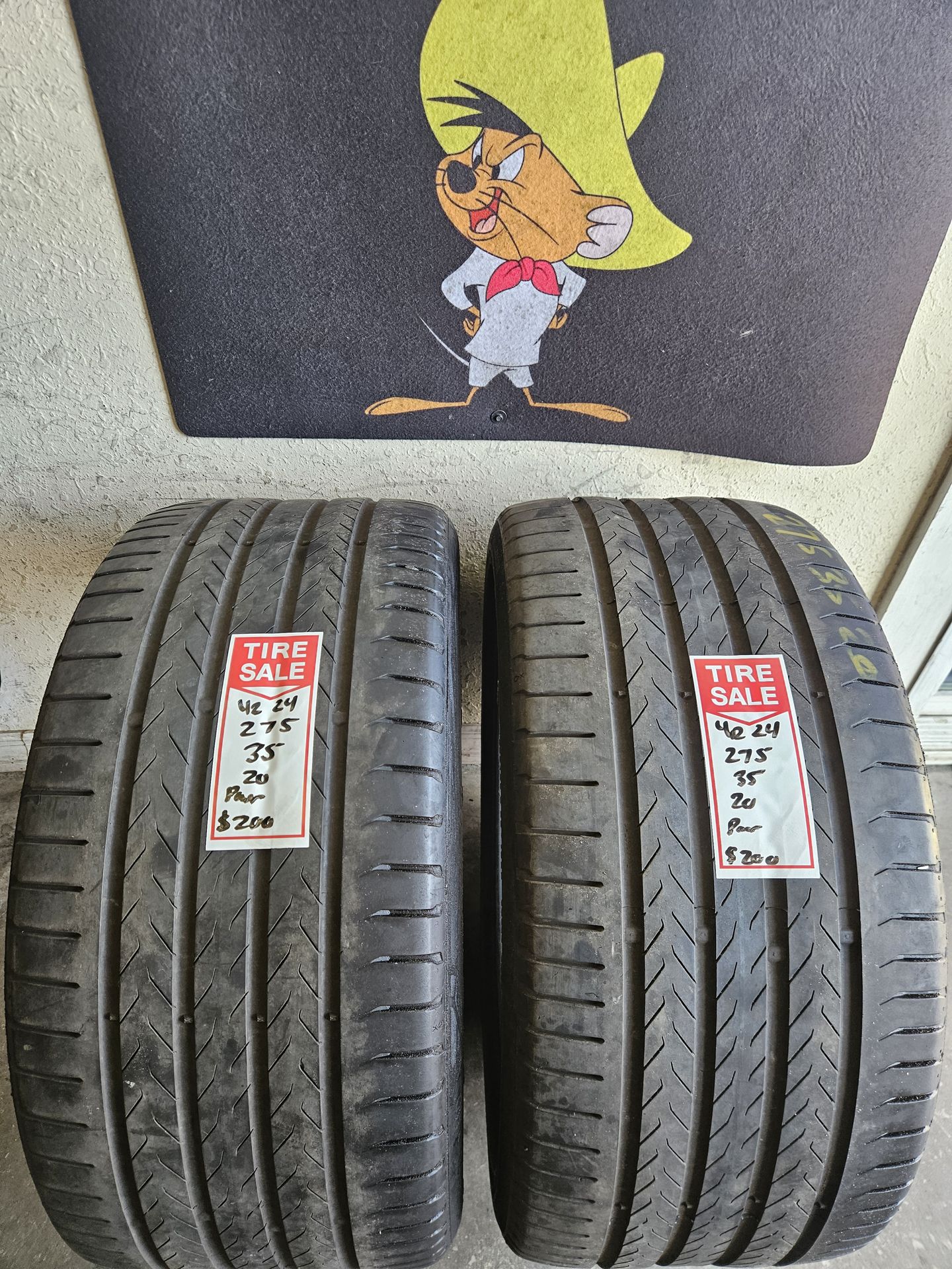 Matching pair of 275/35/20 Continental tires. Tires are in like new condition. Free mounting and balance provided on all of our tires, (tire stretching excluded). Price posted is prior to taxes being applied.