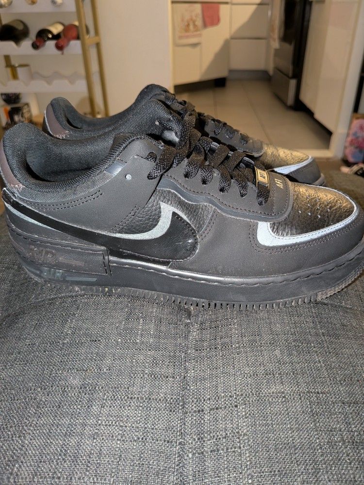 These are Nike Air Force 1 Shadow sneakers in black. They feature a leather and synthetic material mix. The laces are black, and the iconic Nike Air Force 1 sole is present. These shoes are great for everyday wear and streetwear style!