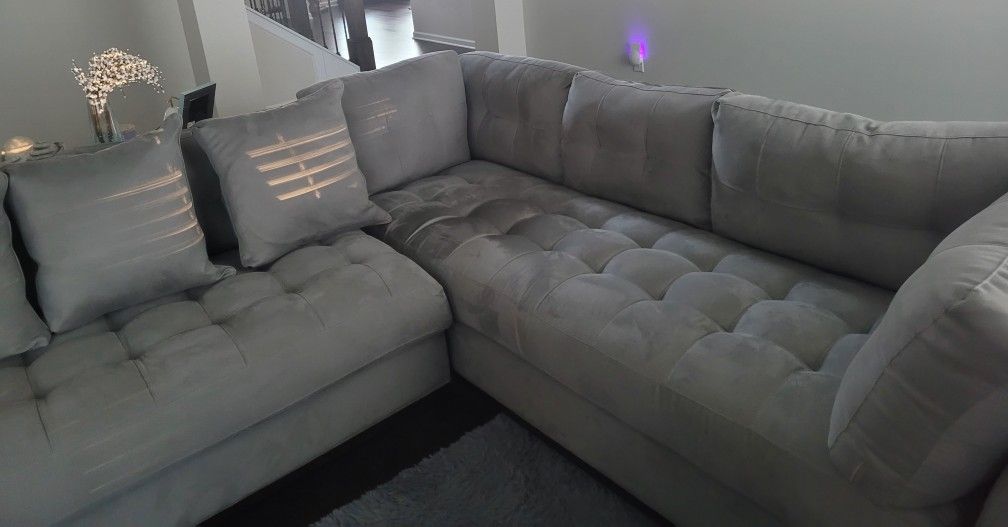 Cindy Crawford designed. Each piece is quality constructed on a hardwood frame for lasting wear, and covered with textured fabric in a neutral gray color. Refined button tufting and a dark brown finished wood base complete each piece. Excellent-Like New Condition.