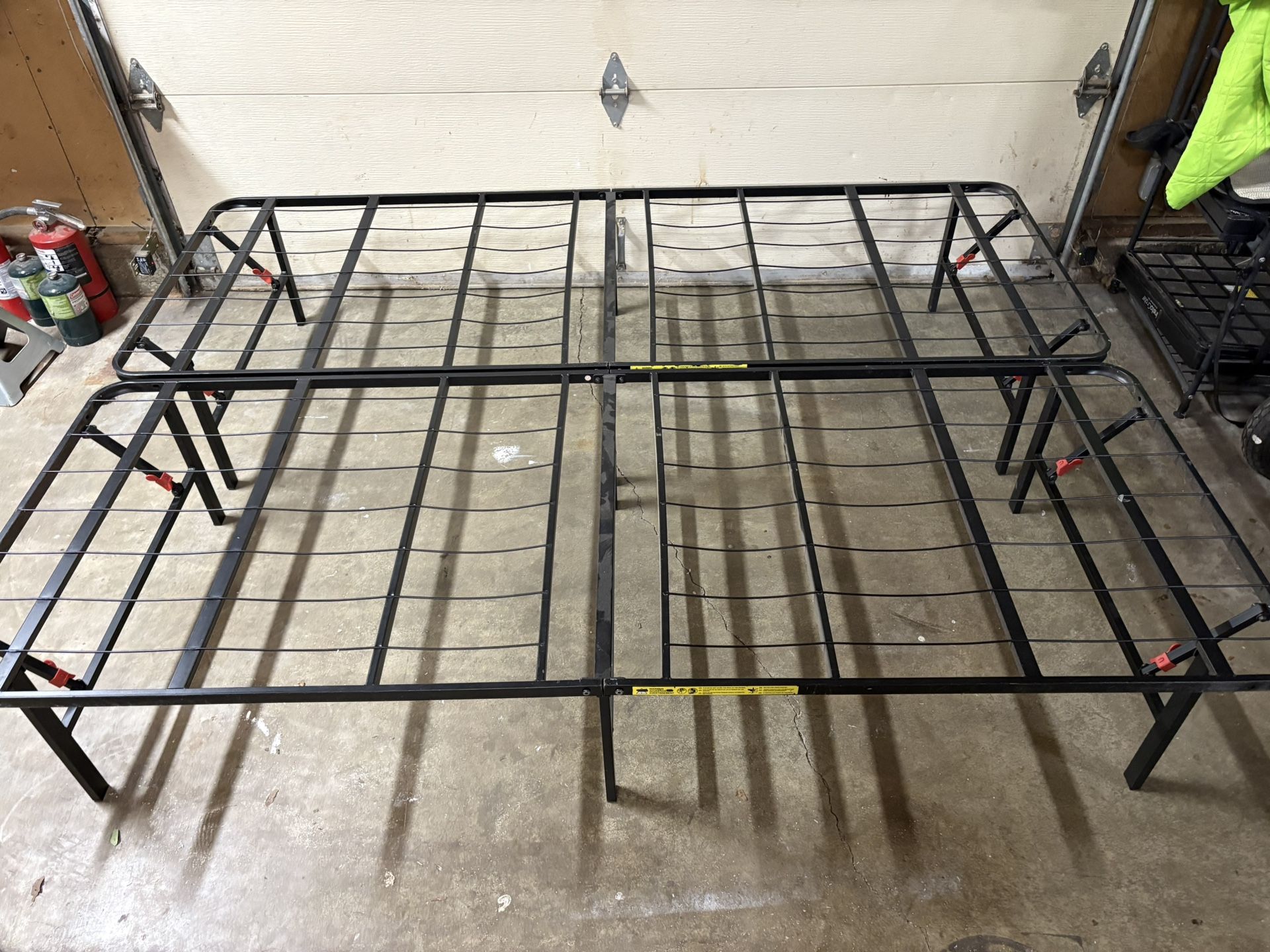 I have two black steel twin size foldable mattress frames for sale. Use one for a twin or put them side by side for a queen size bed. They fold up super easy and compact. Selling each for $30 or the set of two for $50.
