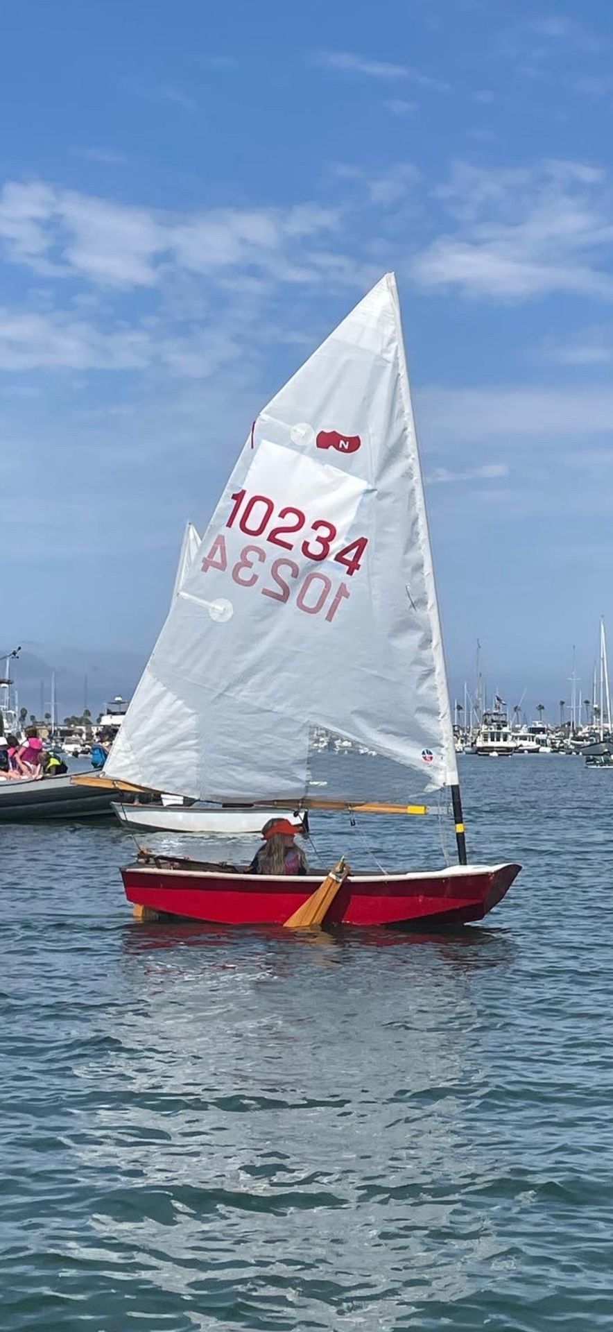 Fire Drill is a great boat with all the bells and whistles. One practice sail and one race sail, monogrammed accessories bag, carbon mast, cover - all the stuff. She has a couple little dings on the front that are easily fixable. Naples Sabot (Sailing Dinghy): Length: 8 feet (2.4 meters) Beam (width): 3 feet 9 inches (1.14 meters) Draft (with daggerboard): 4 inches (10 cm) Mast Height: 13 feet 3 inches (4.04 meters) Hull Weight: 95 pounds (43 kg)