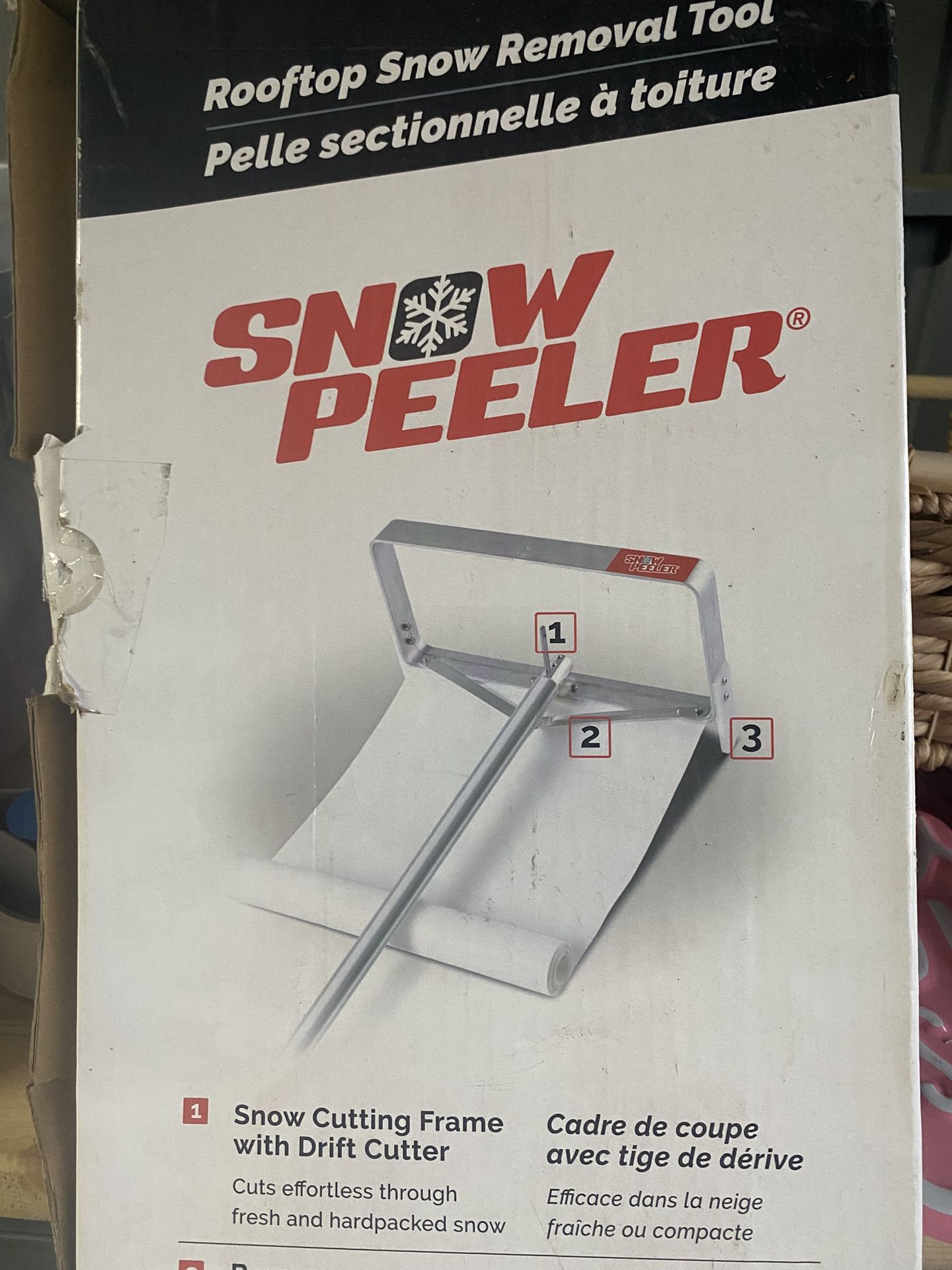 20 foot snow peeler Safely removes rooftop snow faster than traditional snow rakes. Cuts through snow which flows down the slide gravity does the work. Works on fresh and packed snow. Includes four 5 ft. commercial-grade aluminum poles and 9 ft. snow slide Found on a pallet. Box us rough product seems new Pick up only corona $90 obo