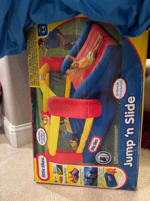 Bouncer with slide for younger kids. Has 2 small holes that can be easily fixed. Comes with blower (works) stakes and box.