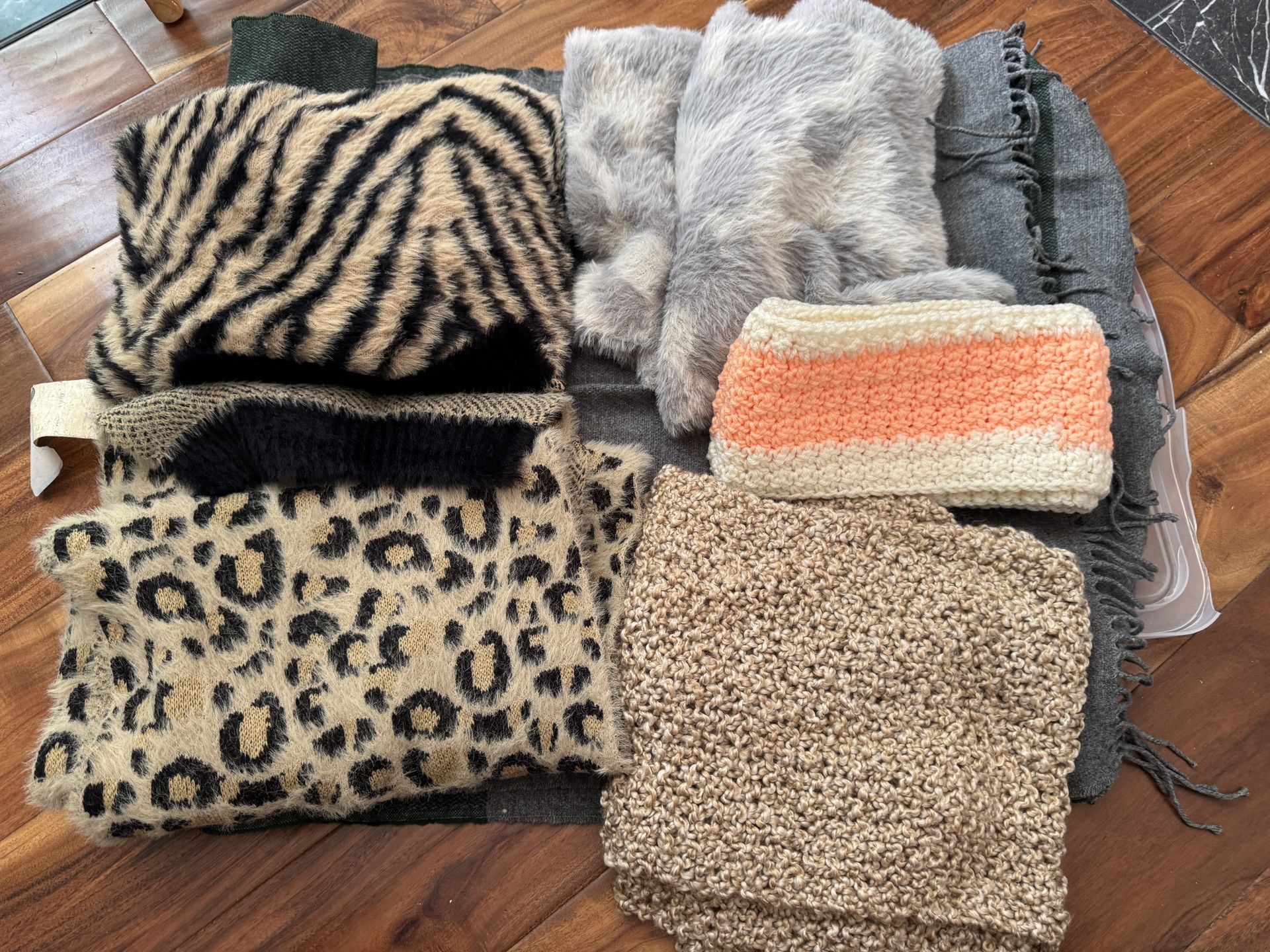 If the ad is active, it's still available. Pick up at this address: 14444 124th Ave NE, Kirkland, WA Selling a bundle of 6 brand new scarves, including: 👗 3 scarves from EXPRESS – trendy faux fur animal print styles (leopard, tiger, and grey faux fur) 🧶 2 unbranded – beige and orange/cream striped 🧥 1 soft woven acrylic scarf by Goodfellow & Co (grey/green) 🧼 All scarves are brand new, never worn 🎁 Perfect for cold weather or as gifts ✨ Stylish, warm, and cozy 💲Full bundle: $18 ($3 each) 💸 Individual prices: $6 each
