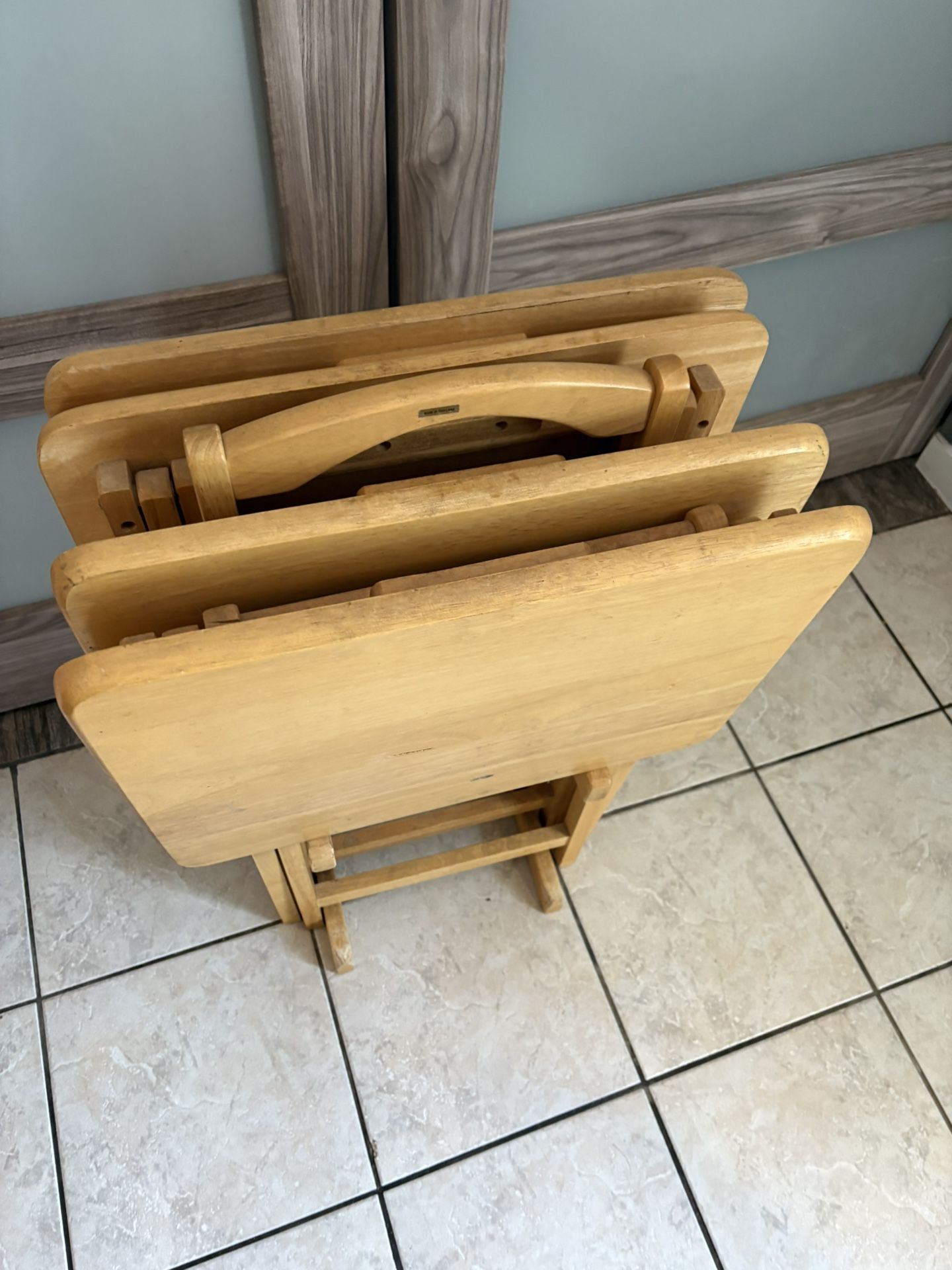 5 piece set of tv trays. 4 tables and 1 stand. Solid wood. Natural color. Tables measure 20” X 14”. Sell on Amazon for $70. Asking $20.