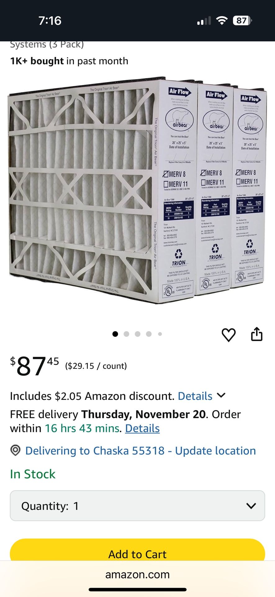 Trion 255649-102 Air Bear 20 x 25 x 5 Inch MERV 8 High Performance Air Purifier Filter Replacement for Air Bear Supreme, Right Angle, and Cub Air Cleaner Purification Systems (3 Pack).