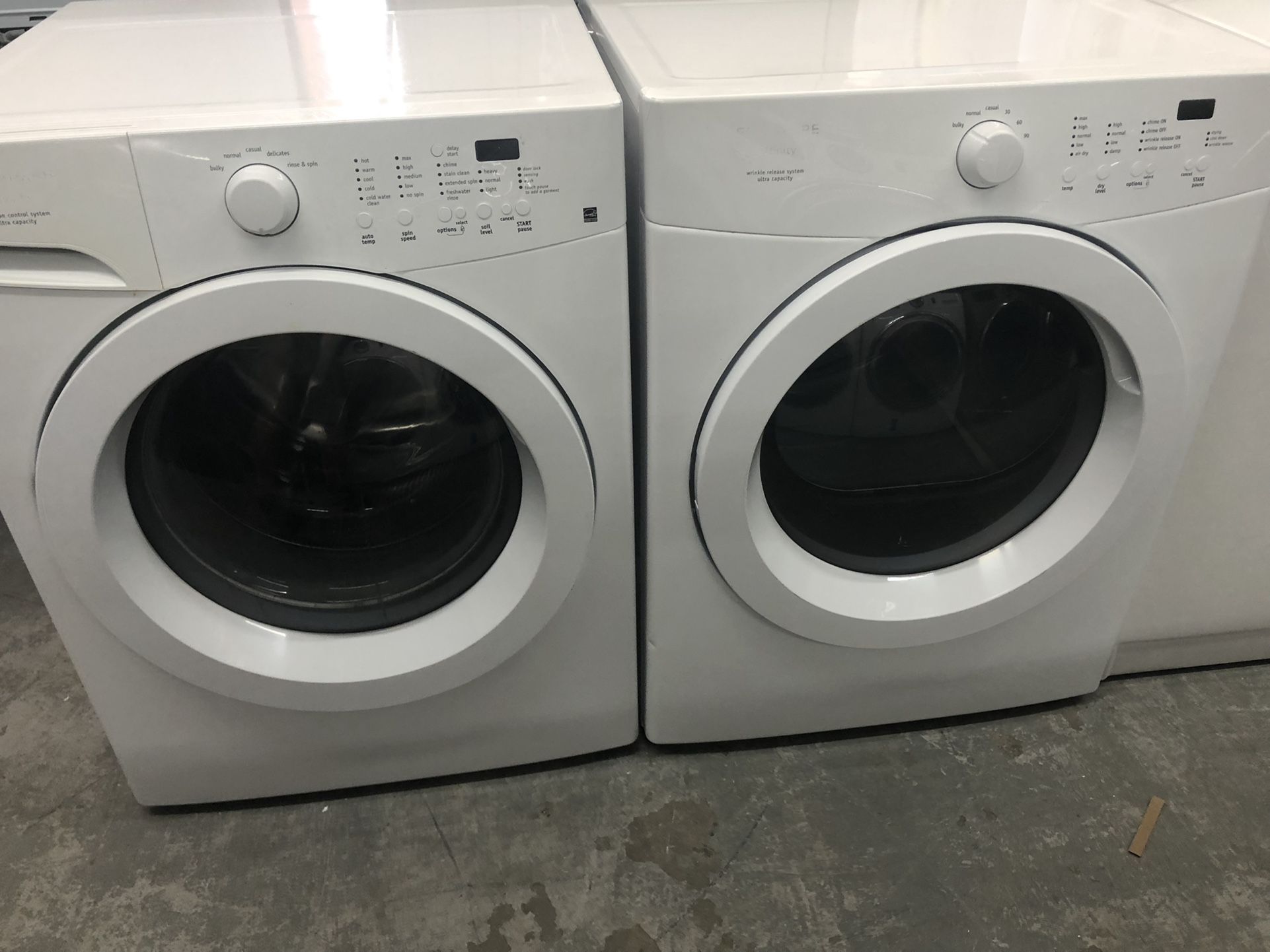 Matching Frigidaire front load washer dryer set. Washer has 10 cycles 5 spin speeds extended spin and fresh water rinse. Matching dryer has 6 cycles 5 fabric care temperatures and wrinkle release. Comes with 120 day warranty. Financing and delivery available.