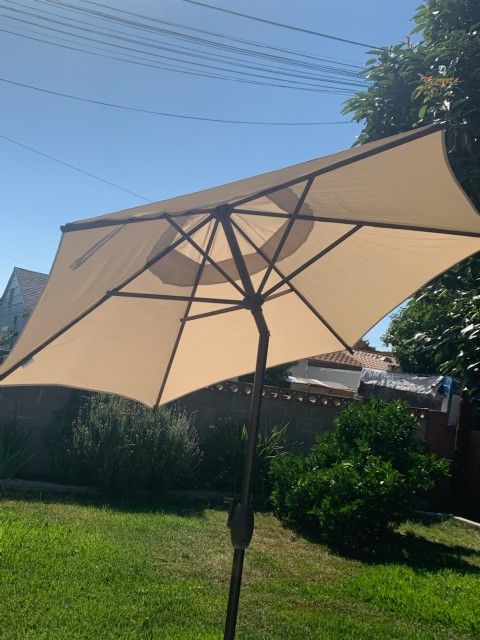 7.5 ft. beige umbrella. New in the box. I have 5 available. Base is not included.