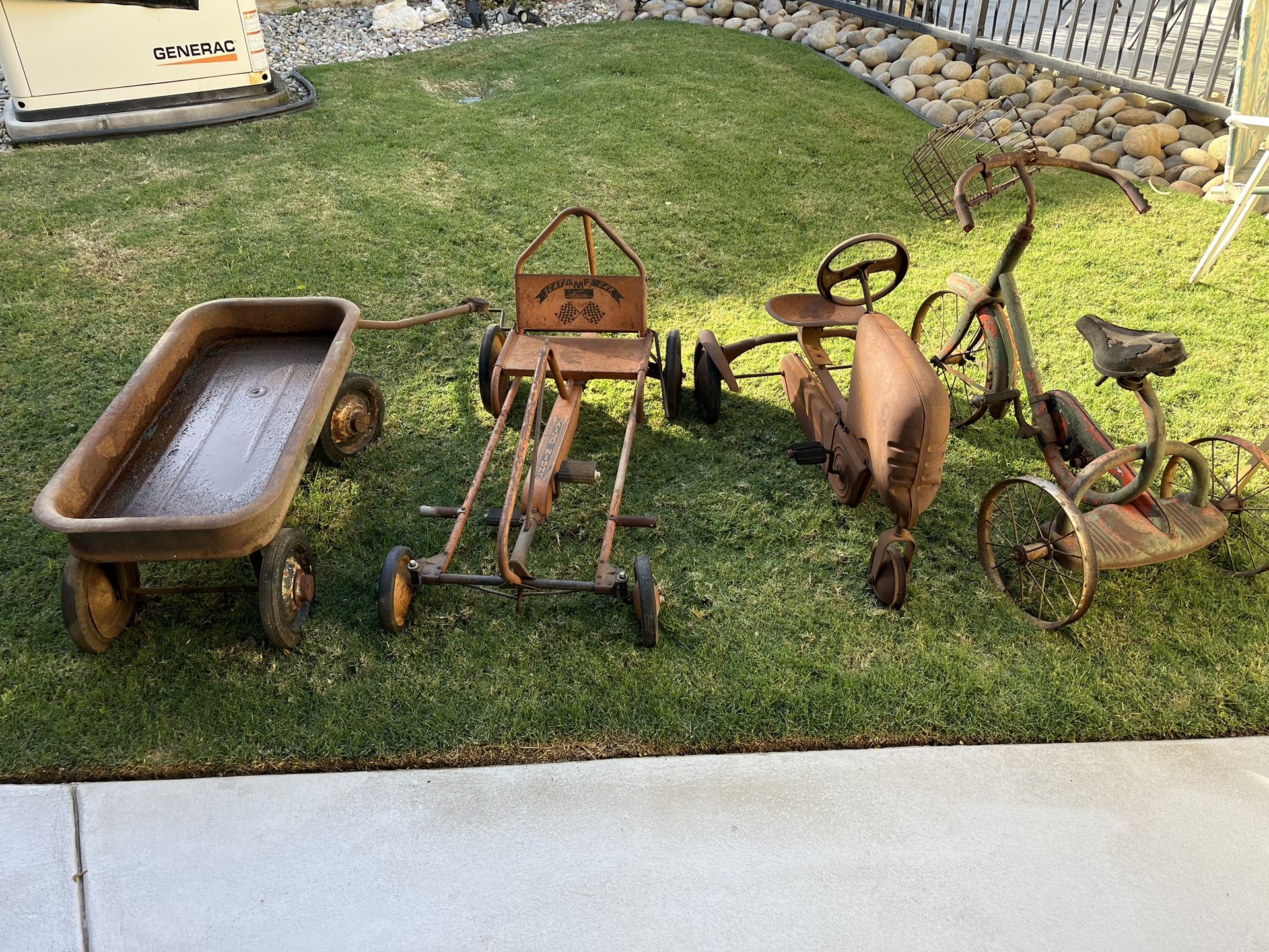 Petal car AMF Scat Jr. circa 50s 18.5 X 36 X 18 Wagon circa 50s 18x36x17 Tricycle circa 30s or 40s chain driven 18x36x30 Pengo Tractor circa 50s 20x36x27.5