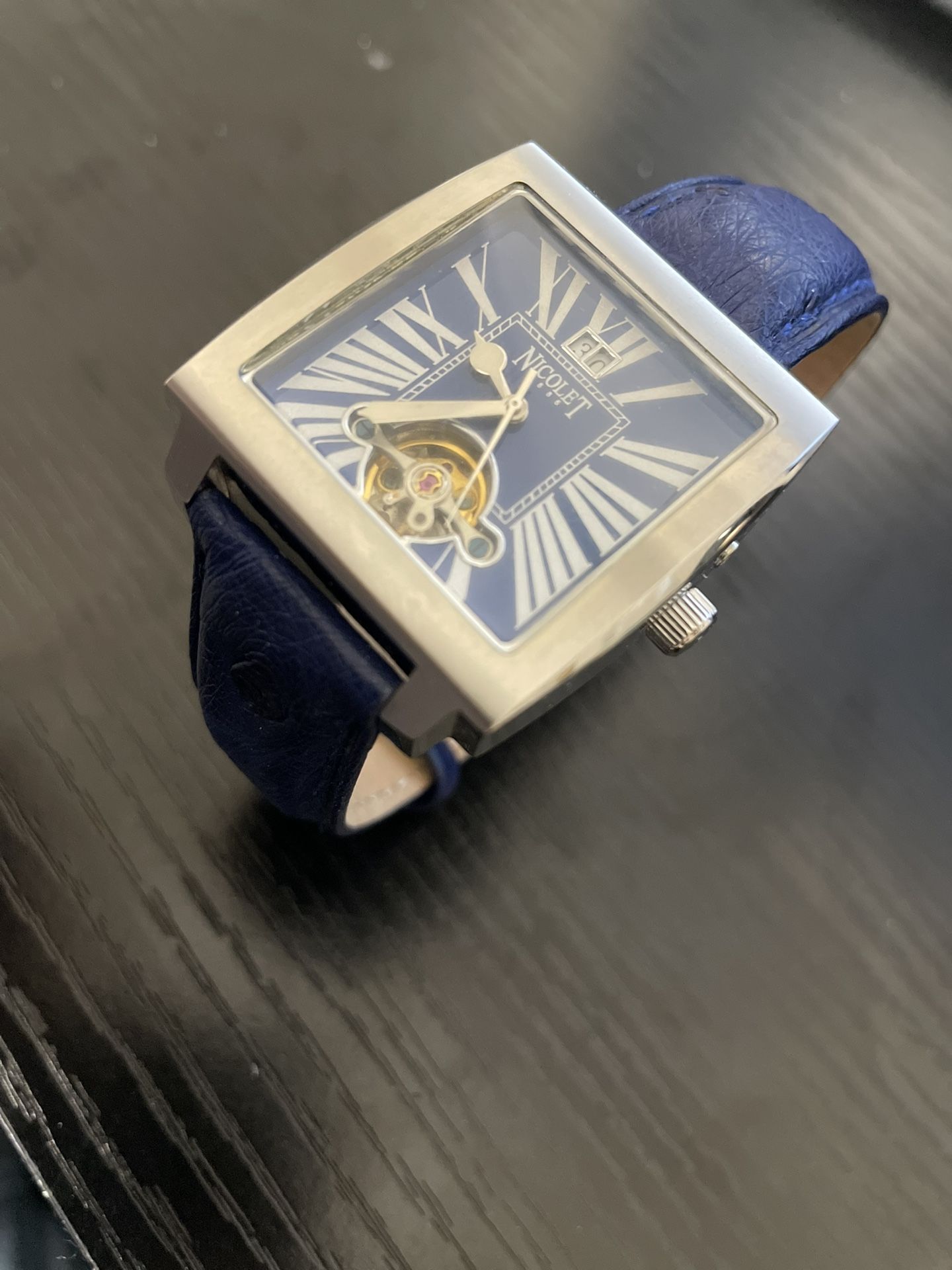 Watch Only. Mint Condition Hardly Worn at All (Blue Lug Width 27 mm Model Nicolet 1886 Watch Shape Square Band Width 19 mm With Original Box/Packaging No Style Casual, Dress/Formal, Luxury Case Size 34 mm Case Material Stainless Steel Display Analog
