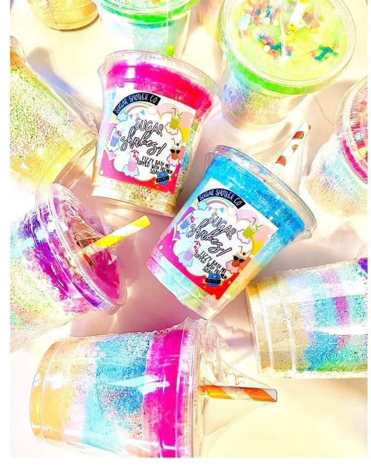 Baths will be more fun with our new Sugar Shakes! A clear plastic cup with layers of colored fizzy bath and a colored soap bar perfect for sensitive skin and topped with sprinkles and skin-safe glitter and fun paper straw! 5 in stock